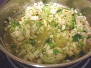 Saute onions in olive oil over medium high heat until carmelized, about 10 minutes. Add remaining ingredients except cheese. Continue to cook, stirring frequently, until liquid has evaporated, about 10 – 15 minutes. Reduce heat about halfway through cooking time to prevent burning.