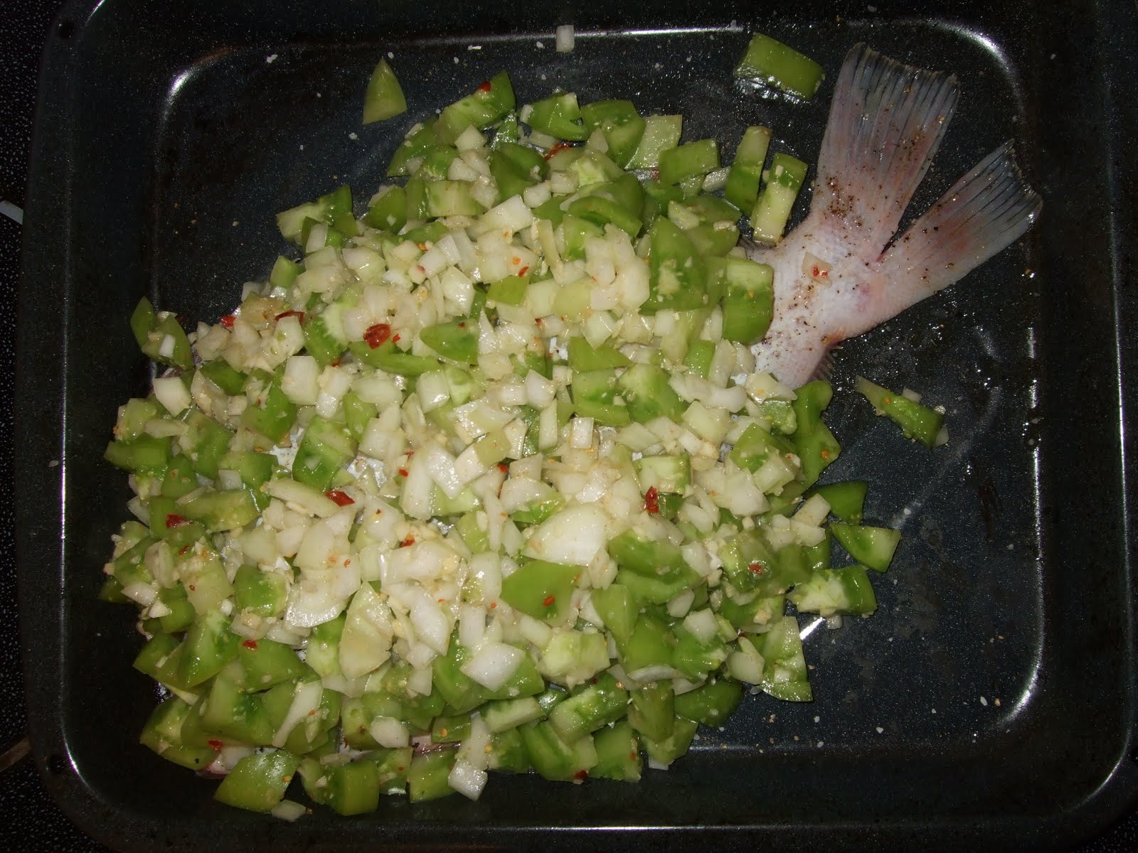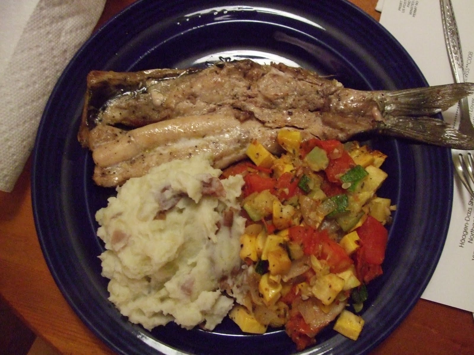 Cover with foil and bake for 20 – 30 minutes. To serve, scrape top layer of fish from bone, set on plate, and cover with tomatoes. Peel off bone and serve remaining fish. Be sure to let a piece or two fall to the floor so The Cat can take it with dignity.