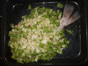 1 whole flounder, 1 – 2 lbs, headed and gutted, skin and tail on