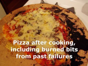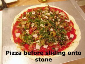 Slide pizza onto baking stone–a few forward shakes, and pretending that you are trying to pull a tablecloth out from under a table loaded with dishes, might help. And remember that even disasters like this still taste good.